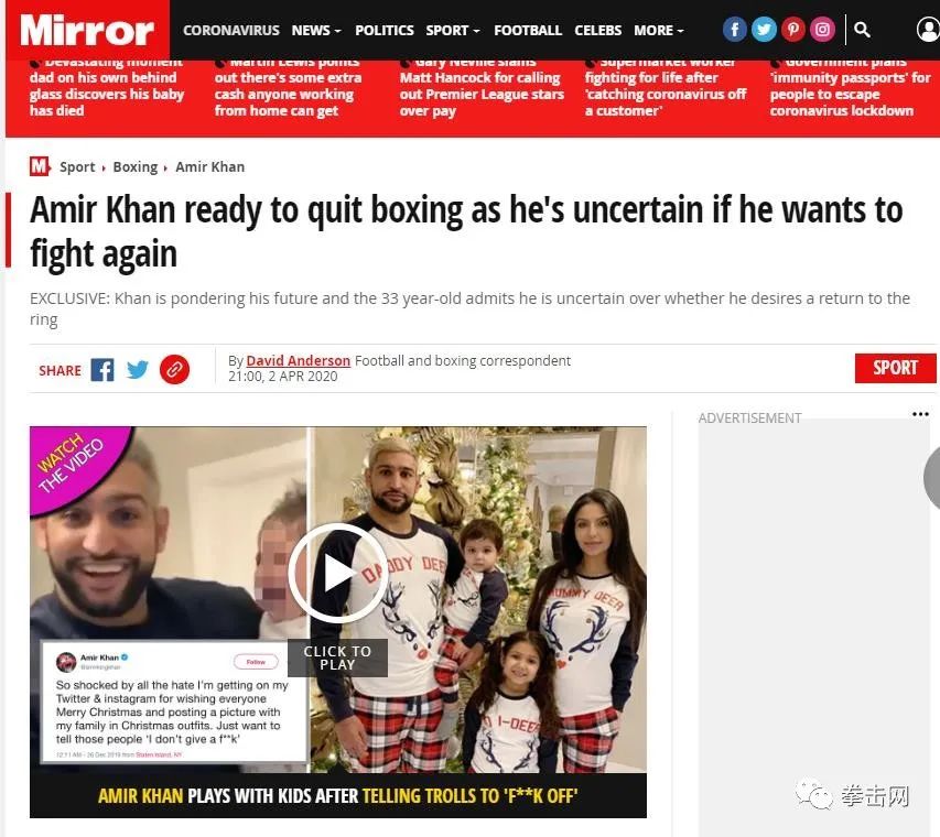 前超轻量级双冠王英国人阿米尔-卡汉(Amir Khan)声称他可能会在疫情期间退役。卡汉承认他可能不会再比赛,因为他在冠状病毒封锁期间与家人一起思考自己在家里的未来,接下来他会看看自己的训练情况,然后决定是否继续。