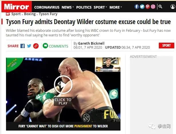 现WBC重量级拳王富里(Tyson Fury)表示维尔德(Deontay Wilder)失败的服装借口可能是真的,言外之意再次嘲笑了维尔德。