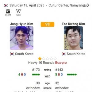 金泰光和金正贤都是百分百终结率 主赛是定居在韩国的乌兹别克斯坦的西罗崔VS.吉野休一郎 吉野唯一败绩是被史蒂文森终结