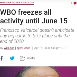 WBO主席弗朗西斯科·瓦塞尔(FranciscoValcarcel)宣布禁止所有的拳击比赛一直到6月15日为止,但是很多拳击业内人士分析到2020年年底才会出现大牌拳手比赛。我们已经知道,在这场冠状病毒大流行期间,基本上每个拳击组 ...
