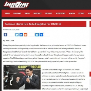 参加“互联网+臂力大赛”据报道,现WBA次中量级超级拳王曼尼·帕奎奥(MannyPacquiao)新冠状病毒监测结果呈阴性。由于不久前帕奎奥和测试该病毒呈阳性的人有过接触。目前帕奎奥声称他在公开声明中“已经开始家庭隔 ...