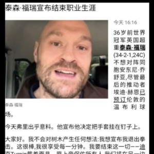 (机译截屏) 今天,36 岁的前英国重量级世界拳王泰森-富里(34-2-1,24KO)出人意料地宣布结束自己的拳击生涯,也结束了与同胞安东尼-约书亚可能的对决。 富里和约书亚的推广人弗兰克-沃伦(Frank Warren)和埃迪- ...