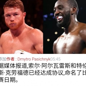 媒体报道阿瓦雷兹与克劳福德达成协议,比赛日期已确定9月开战 据报道,统一超中量级拳王墨西哥人索尔-阿瓦雷兹(Saul Alvarez)与 WBA 超次中量级拳王美国人特伦斯-克劳福德(Terence Crawford)已在周六于伦敦举行 ...